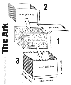 The LORD then showed Moses the three-in-one pattern (i.e., tavnit: תַּבְנִית) according to which the sacred place of the mikdash was to be surrounded by a mishkan (מִשְׁכָּן), or a tent-like dwelling place set apart for the Divine Presence. First an ark of acacia wood was to be overlaid with pure gold inside and out. The ark was to be fitted with gold rings and gold covered poles to make it portable. The two tablets of the law were to be stored inside the ark. Two cherubim (angel-like figures) were to placed facing each other over a cover of the ark called the kapporet (i.e., "Mercy Seat"). The ark was to be housed within an inner chamber of the tent called the Holy of Holies. Adjacent to the Holy of Holies was a second chamber called the Holy Place. This chamber would contain a table overlaid with pure gold that held twelve loaves of bread along with a golden, seven-branched menorah. The Holy of Holies was separated from the Holy Place by an ornamental veil called the parochet before which a golden altar of incense would be placed.